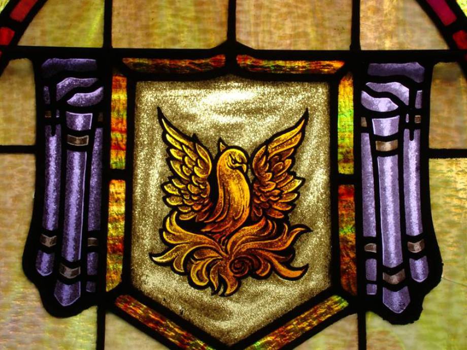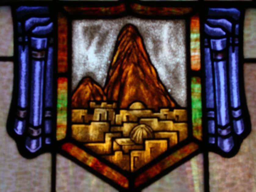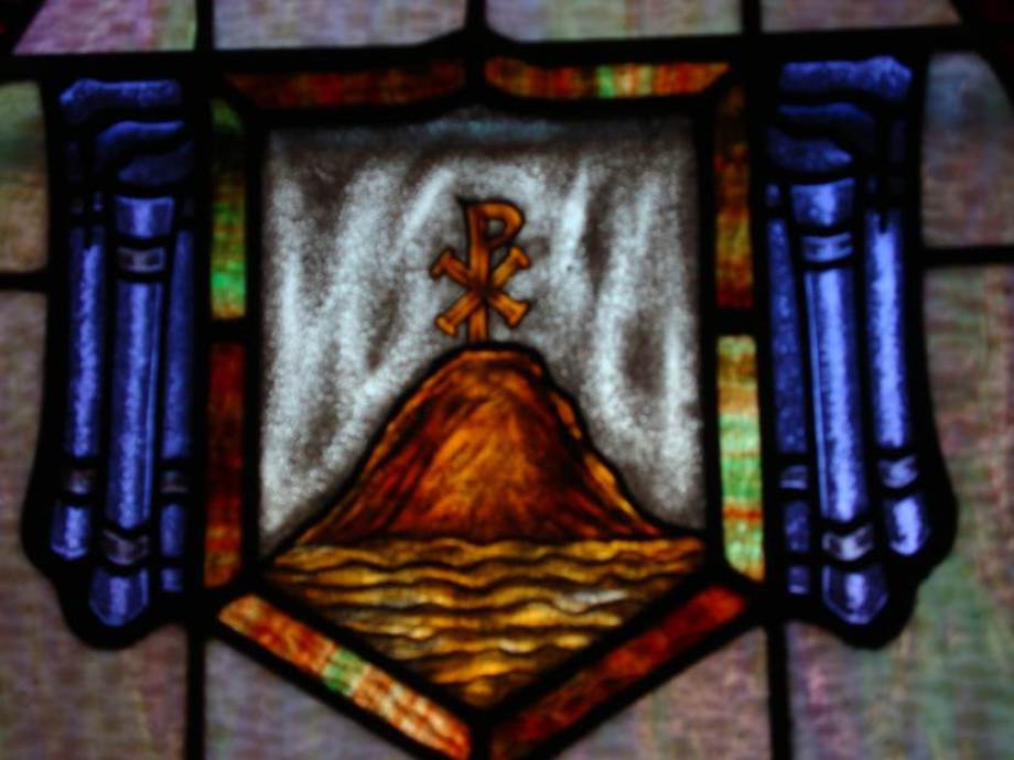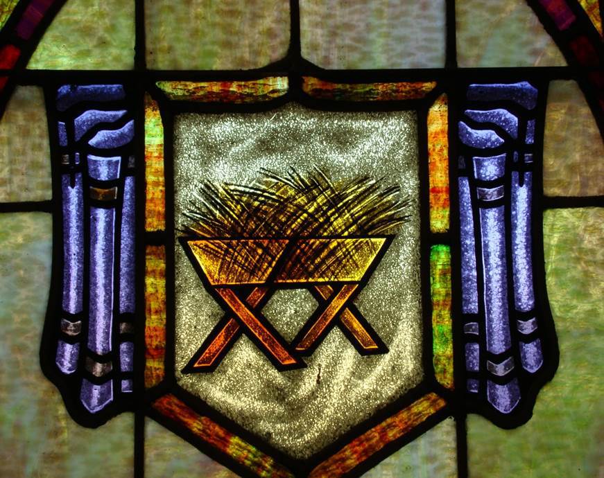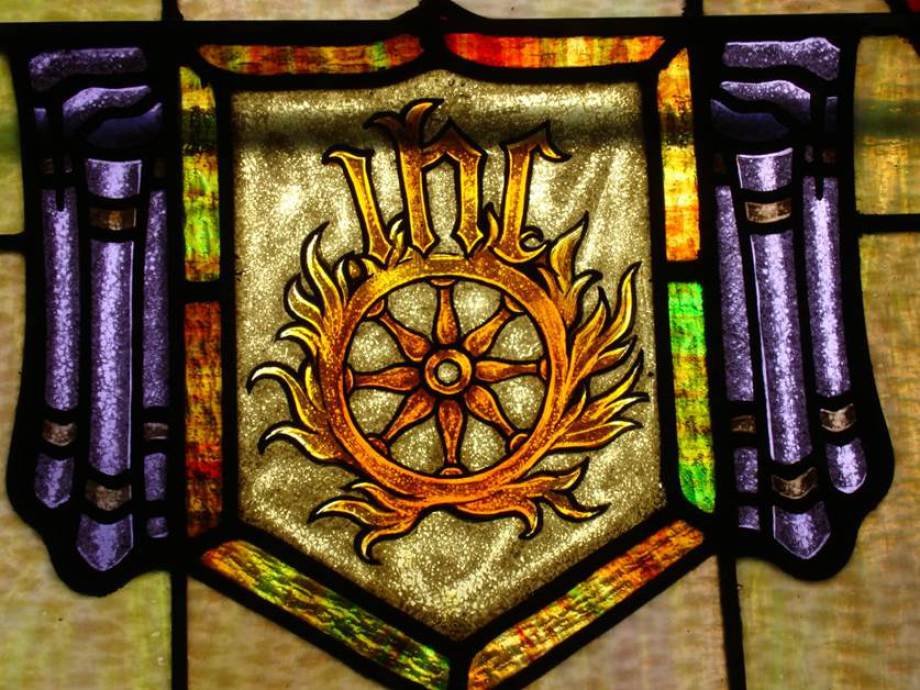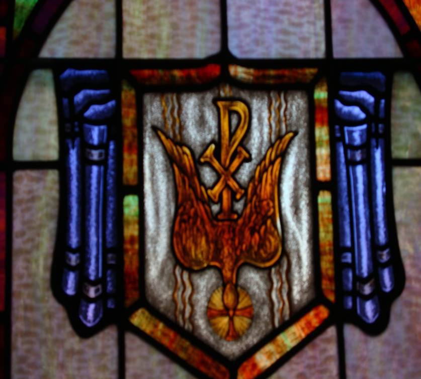 Symbol of Christ’s Ascension into heaven. The wheel surrounded by flames of fire refers to Elijah being taken into heaven in a fiery chariot. The three letters are the first three Greek letters of Jesus. This, then, is a symbol of Christ’s Ascension.