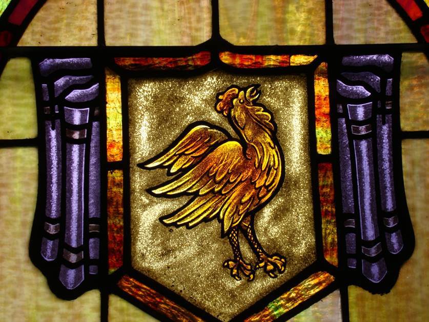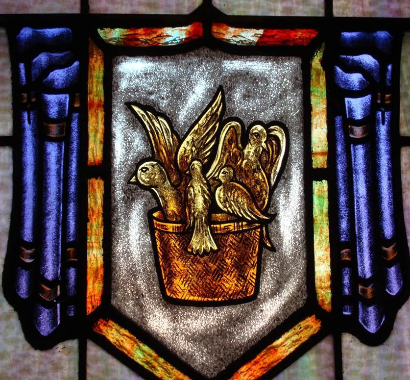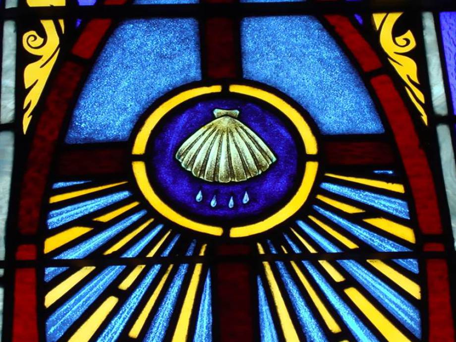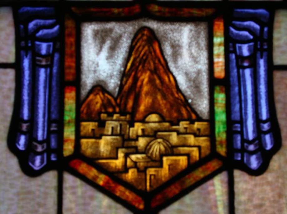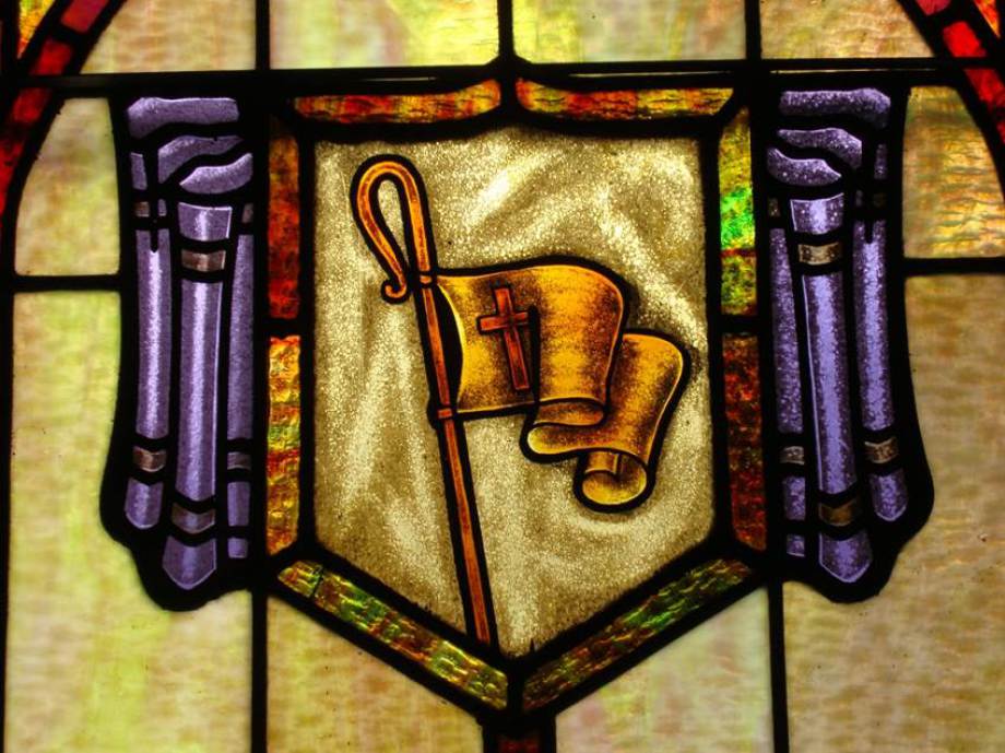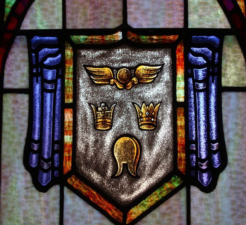 Symbol of Christ’s Ascension into heaven. The wheel surrounded by flames of fire refers to Elijah being taken into heaven in a fiery chariot. The three letters are the first three Greek letters of Jesus. This, then, is a symbol of Christ’s Ascension.