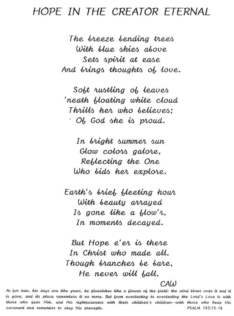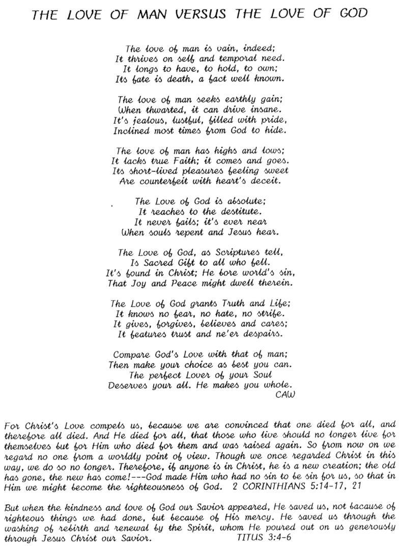 Well, Pastor Ramsbacher received a book indirectly from a member of a former church which he served, entitled “Poems and Writings by CAW. It contains: prayers, uplifting scripture based poems of hope, love, songs, faith, about adversity and illness and much more. The author wants to be anonymous and we were given permission to use anything in his/her book at any time. Thank you CAW!