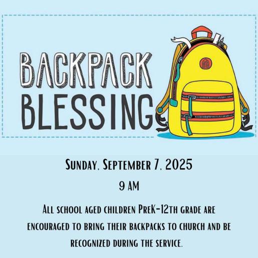 All PreK-12th grade students are encouraged to bring their backpack to church on Sunday, September 7 at 9 AM for a special Backpack Blessing that will take place during the service. All students starting their first year of preschool, 1st, 3rd and 5th grades will also receive a special book during the service.